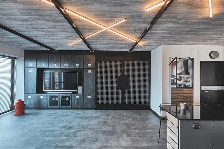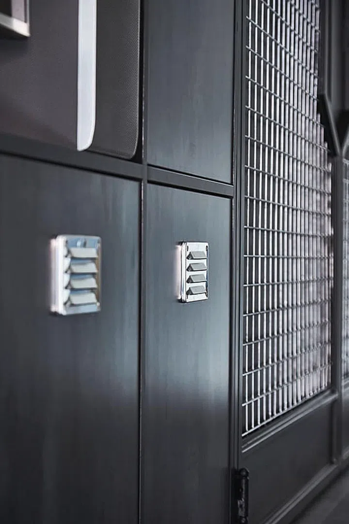 The TV is nestled within a full-height console built with storage cabinets, with metallic angled vent detailing on the doors, making them look like lockers – another unique product of Kelvin’s design.