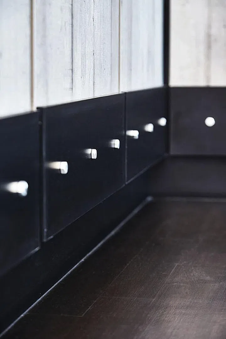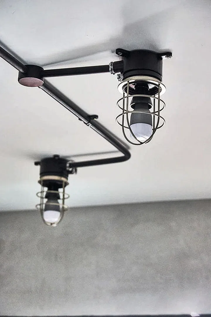 Kelvin wove in features borrowed from industrial worksites for a more compelling theme. For example, the cage lights in the kitchen are “shipyard-inspired”