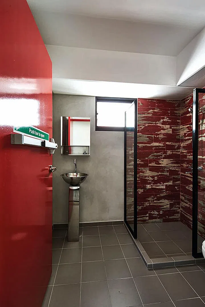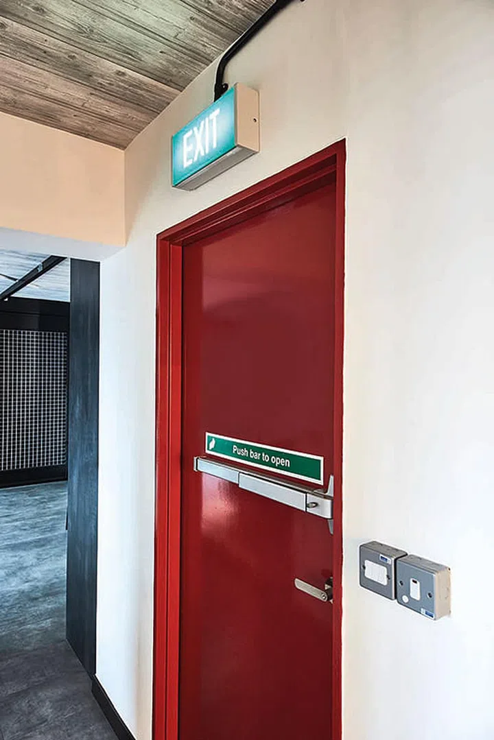Surprises abound in this modern home. What appears to be a door for an escape route turns out to be the entrance to the common bathroom. This cheeky touch is enhanced with a fluorescent exit sign over its fire engine red door and a decorative crash bar.