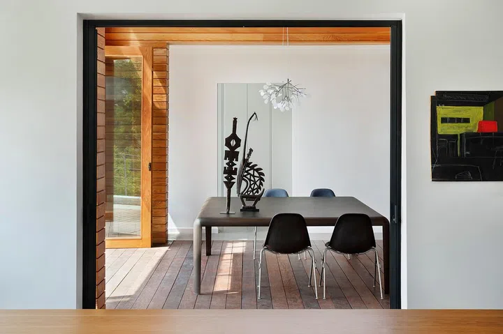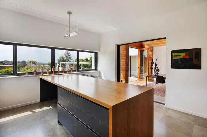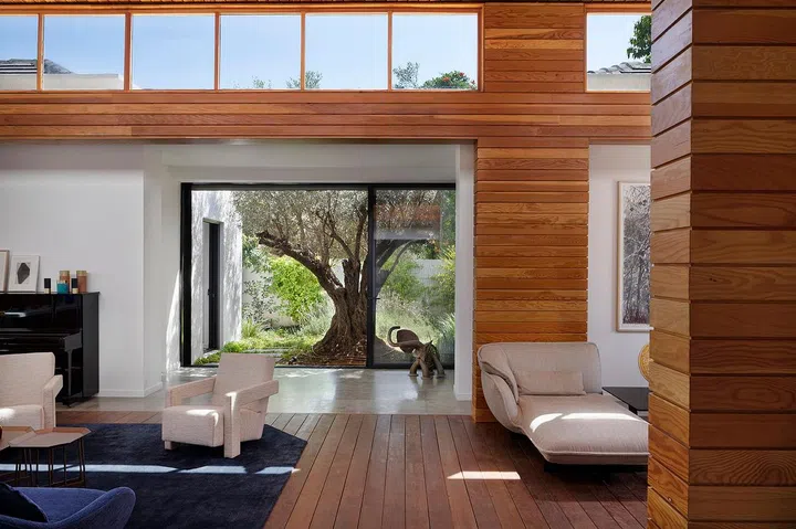 The shed connecting these two volumes is constructed from lighter materials, featuring timber cladding, timber flooring, and skylights that wrap around its perimeter.