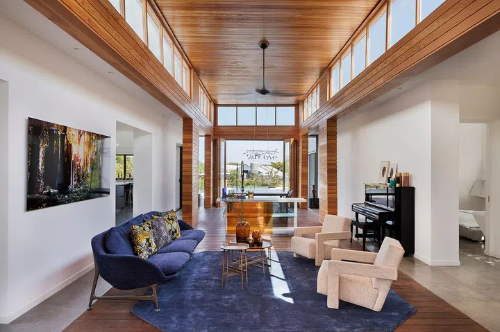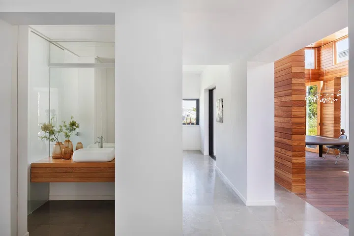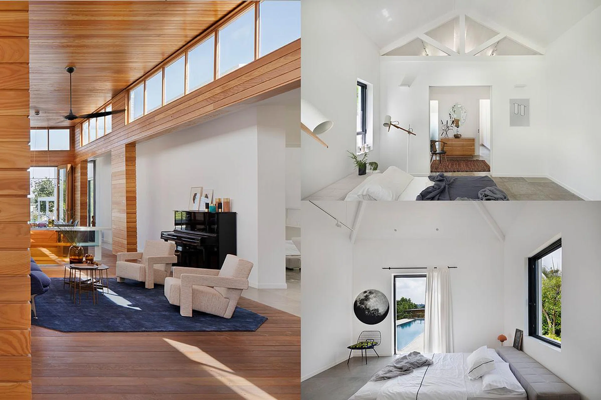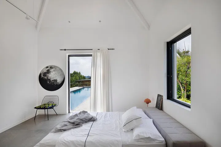 The house’s two main volumes feature all white-washed interior, concrete flooring and pitched ceilings with exposed structure.