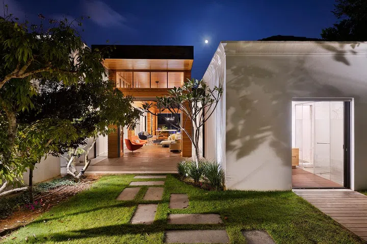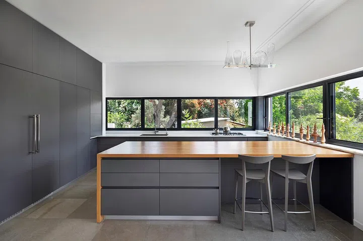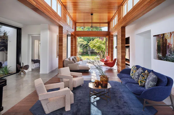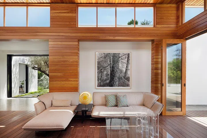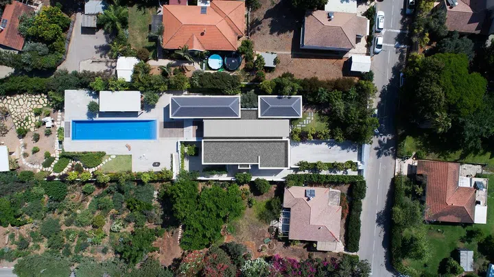 The house is home to a couple and their two adult daughters; each family member needs a private space to retreat, as well as communal areas for quality time together. Irit and Zohar catered to this brief by creating a home that comprises three parts: two rectangular main volumes connected by a strip of lighter structure dubbed as 'the shed'.