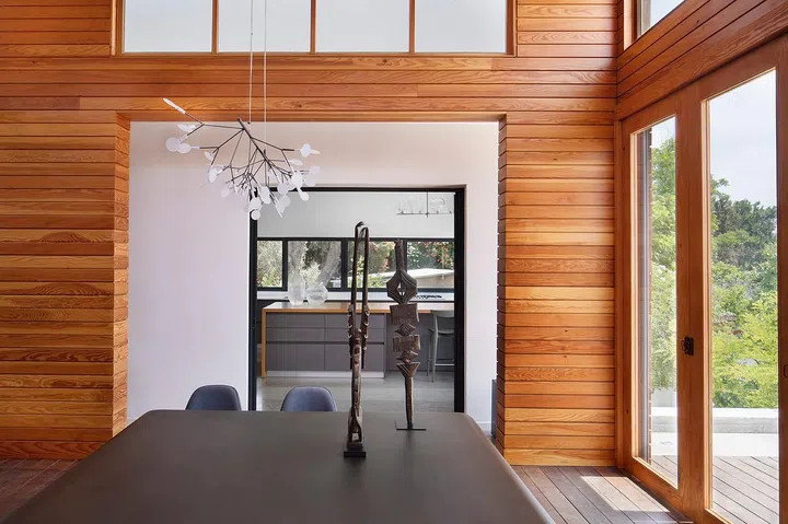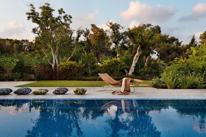 The backyard is the designated area for entertaining and hosting, featuring a pool whose size rivals the house’s main volume and a sheltered dining area.