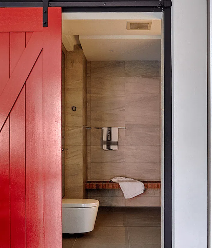 The spacious bathroom features a bench and a large entrance; it was designed with the elderly occupants in mind.