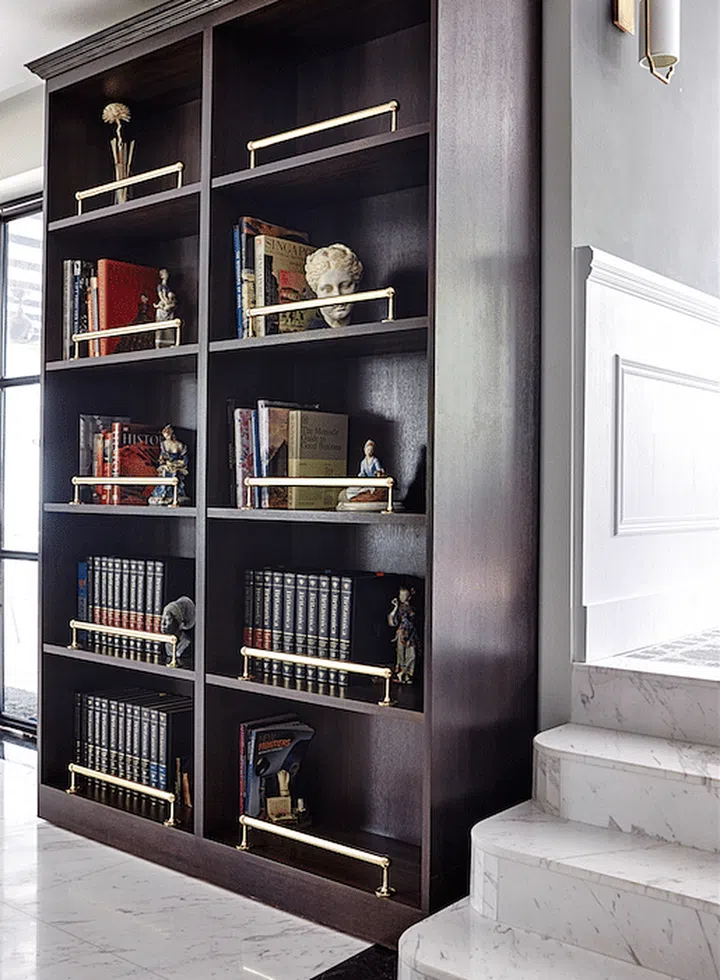 Alex also designed an Art Deco-style bookcase with brass handles — a quintessential to the style — that conceals the store room.