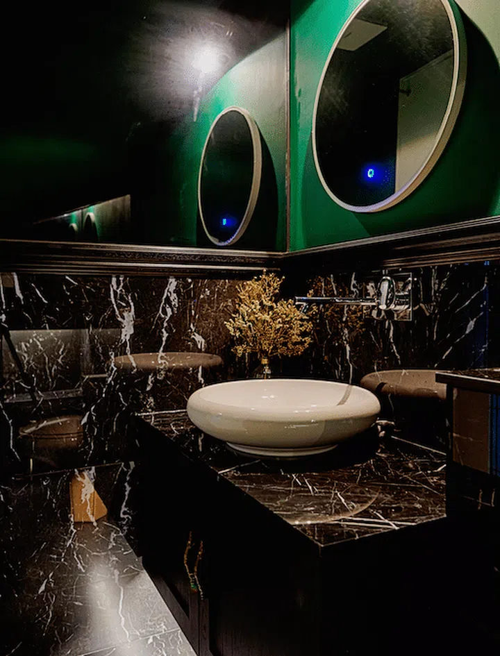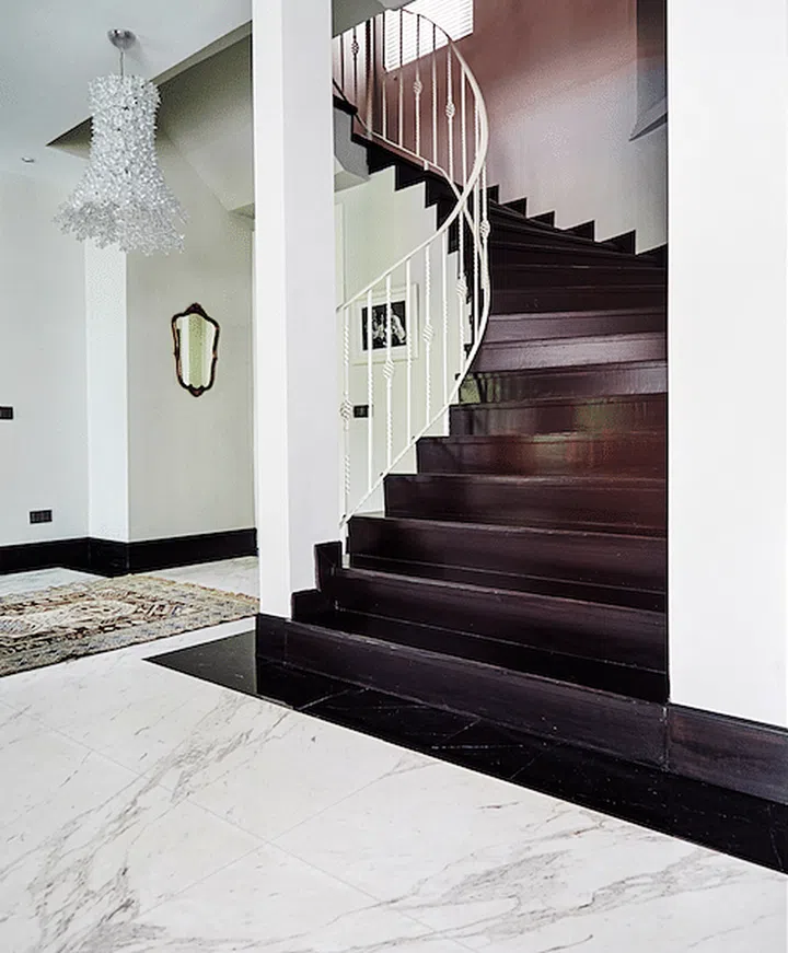 The powder room, situated near the staircase, features the same black marble used for the customised dining table.