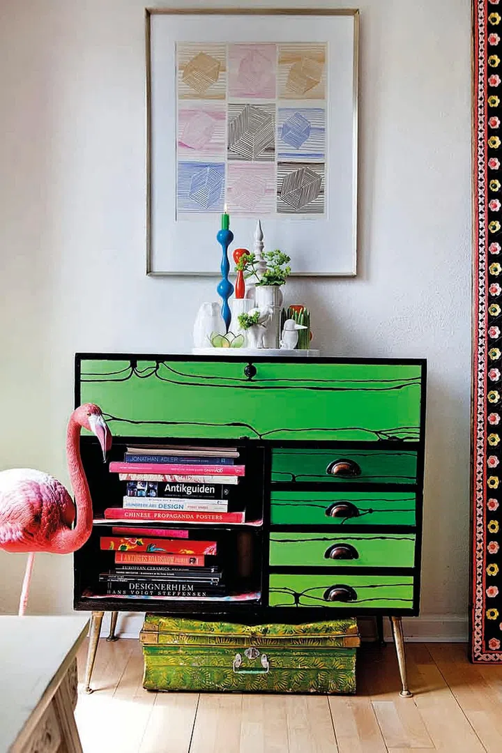 Tatjana painted the living room's retro-style storage unit a lively green, and her artist friend Idris Johor added black woodgrain patterns. The metal suitcase underneath is a souvenir from Kathmandu. The kitschy pink flamingo completes the mesh of vigorous colour.