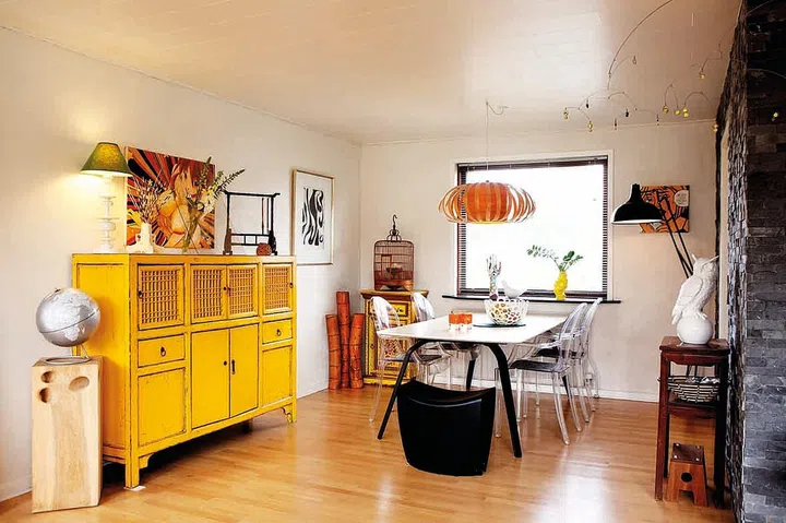 In the dining area, Baroque-inspired acrylic Ghost chairs by Philippe Starck are paired with a spare, retro-style dining table. A canary-yellow Chinese herb cabinet, which she bought from a friend who operates Fairprice Antique in Singapore, brightens up the room and provides convenient storage space.