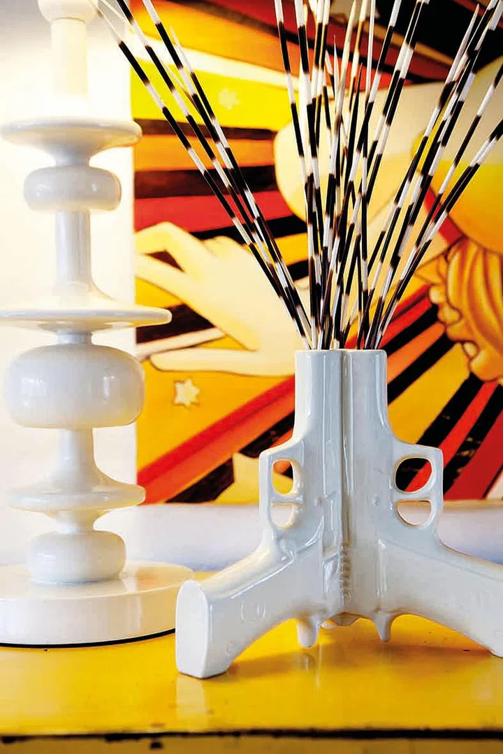 Tatjana filled this ceramic pistol vase with porcupine quills bought from Blavand Zoo in Denmark.