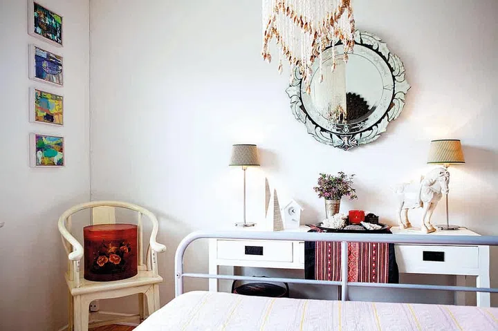 Tatjana's bedroom conveys a quiet air, with subtle yet interesting accessories like a windcatcher made of shells and a cream-coloured, Oriental-style armchair.