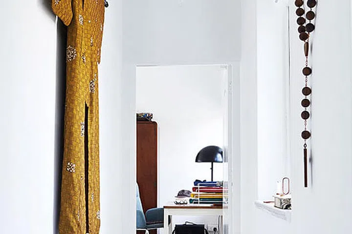 As you ascend the stairs to the upper level, you’re greeted by a hallway that showcases the owner’s global influences. A wall-hung kimono, a rosary from a gothic market in Barcelona, and a vintage Turkish shoe-polish kit are just a few of the eclectic items on display. These objects not only add visual interest but also tell the story of the homeowner’s diverse experiences and travels.