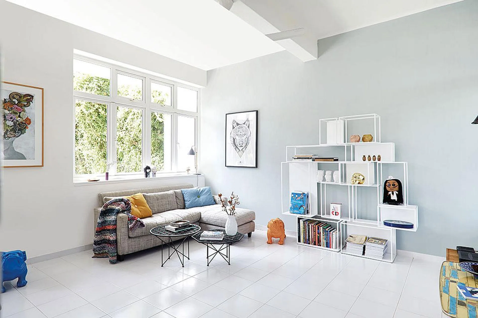 As you step inside, the sense of calm and tranquility is immediately palpable. The white walls and floors create a bright and airy atmosphere, allowing the natural light to flood the space and highlight the owner’s carefully selected pieces. The minimalist furnishings, such as the Grafunkt shelves and coffee tables, provide a clean and unobtrusive backdrop, ensuring that the focus remains firmly on the owner’s prized possessions.
