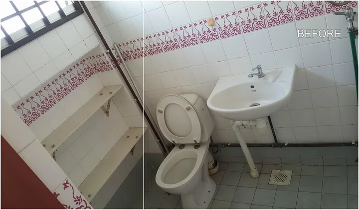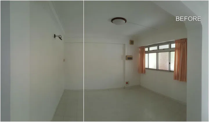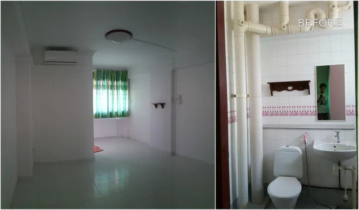 The large and spacious master bedroom came with an old HDB-style en suite bathroom with water and sewage pipes exposed.