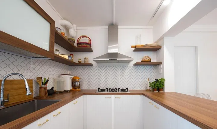 Although the new kitchen is smaller, it has a practical U-shape layout and everything is kept within easy reach.