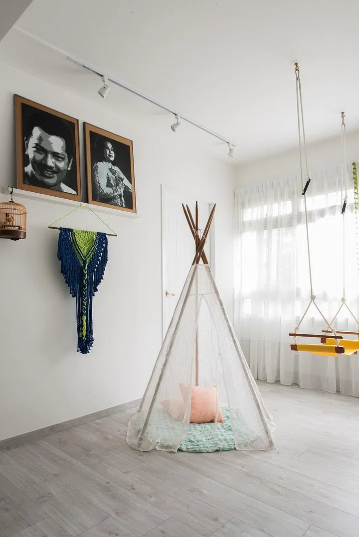Interior designer Leon Luo of Free Space Intent tells that the design of this renovated 5-room HDB flat home is based on a bohemian theme.