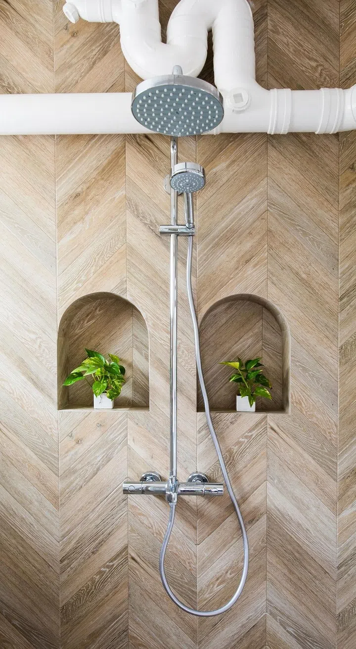 Wood-look tiles laid in a chevron pattern introduces warmth into the bathroom.