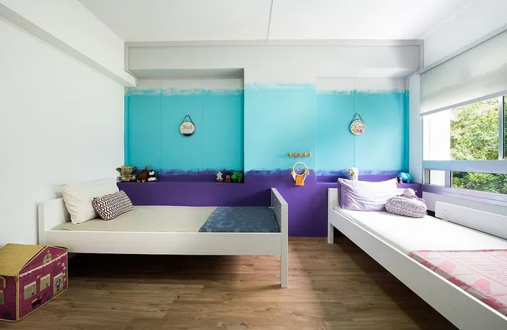 The interior designer and homeowner decided to inject pops of vibrant teal and purple- juxtaposed with warm and comforting wooden flooring - to the children's bedroom.