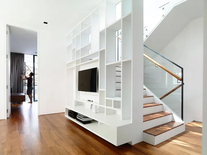 The white theme extends onto the other levels of the home, complemented by the use of wood flooring and rail.
