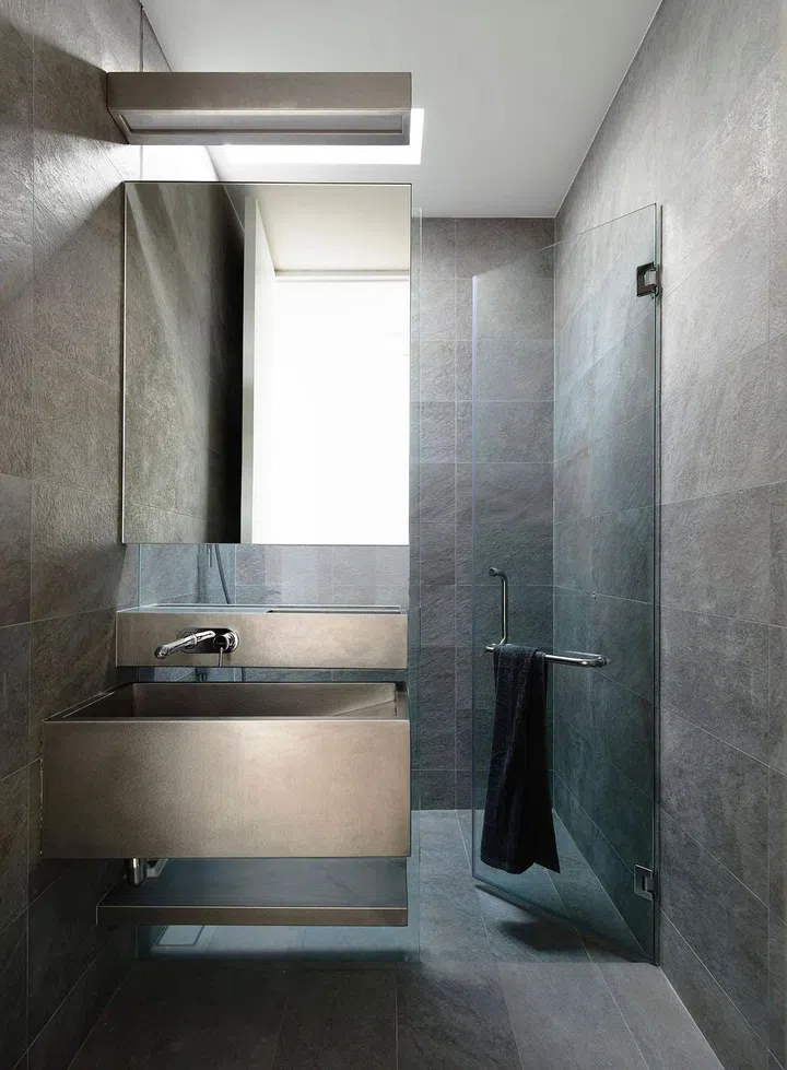 In the other bathroom, grey slate tiles create a different look that is no less sophisticated and chic.