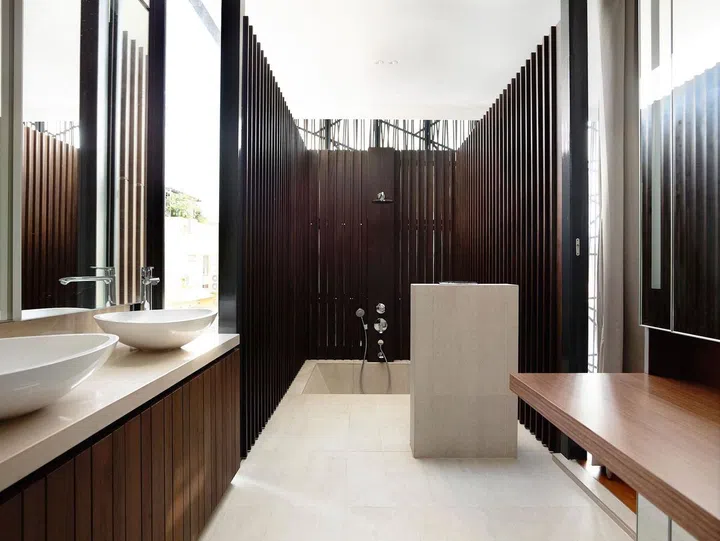 The highlight of the home lies in the master bathroom, where the walls are lowered to allow the black screen to show through without compromising on the privacy of the space. At the same time, the Onsen-style sunken bath makes the space feel even more intimate and natural.