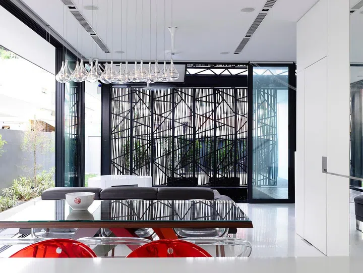 Behind the screen, the black hue suddenly melts away to contrast with an all-white interior. The stark difference makes the interiors look even more impressive, accented by touches of black in the metallic framework and interior design elements.