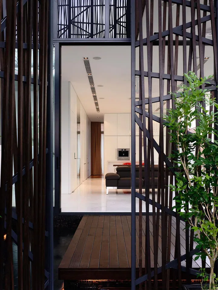 Once you’ve gotten past the black fence and the outstanding look of the geometric black screens on the façade, a wooden deck leads across a pond to the entrance of the house.