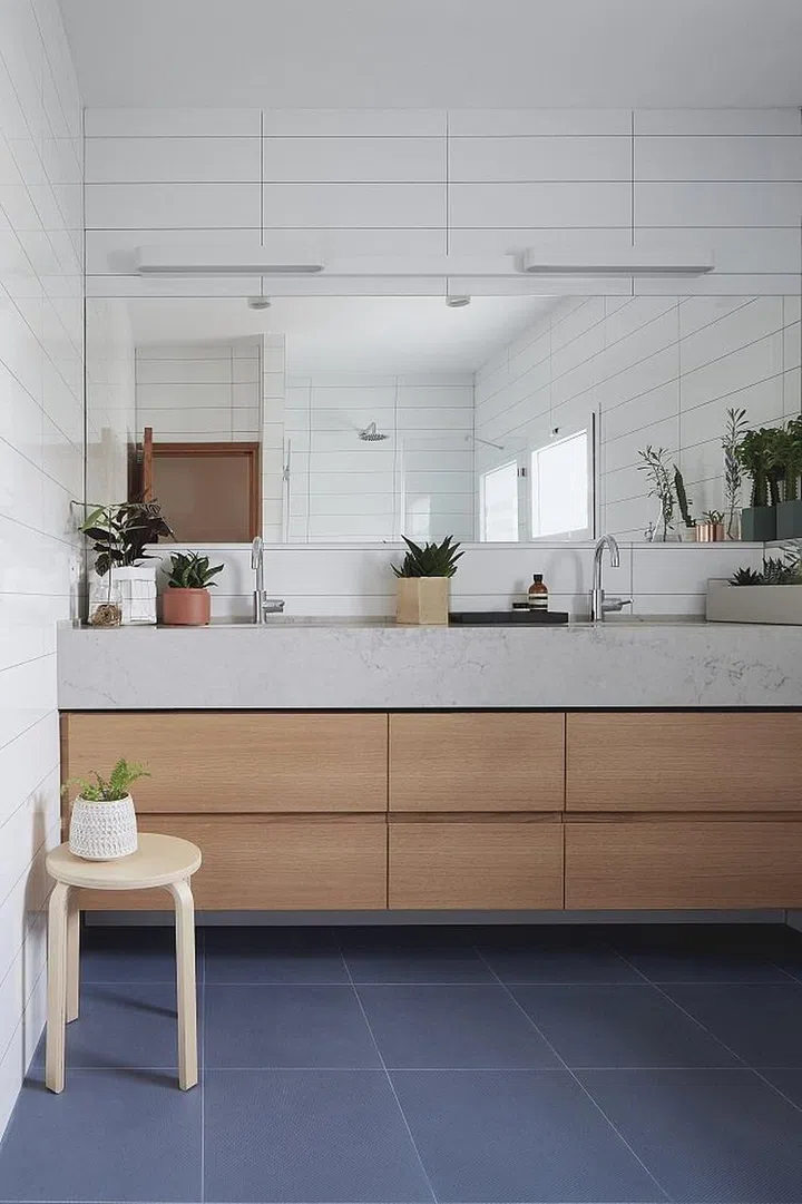 Another example would be this light grey marble countertop, which was used in both kitchen and bathroom. We love the soothing shade of blue used here.