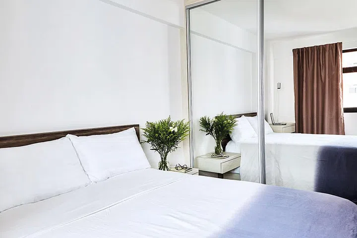 The bedroom received equally thoughtful treatment. Full-height mirrored doors for the master bedroom’s wardrobe create an illusion of expanded space, making the room feel significantly larger and more open. This clever BTO renovation technique maximizes both functionality and perceived square footage