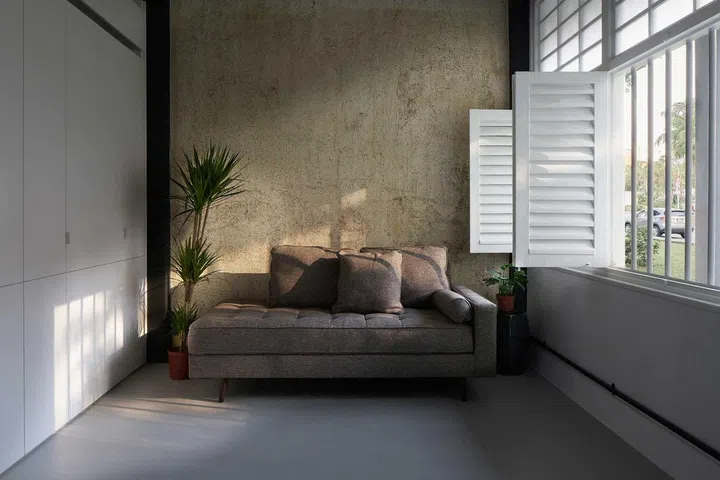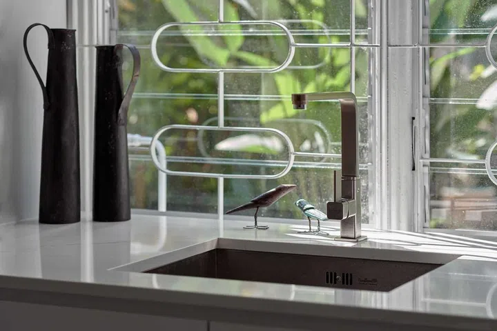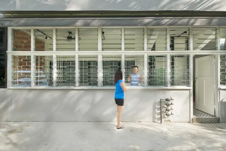 Throughout the Tiong Bahru ground-floor home, original architectural elements were treated as precious artifacts of family history. Window grilles, shutters, and vintage mosaic tiles were carefully restored rather than replaced, preserving these tangible links to the siblings’ childhood memories. Each of these elements carries stories of growing up in Tiong Bahru, making them irreplaceable features of this nostalgic design.