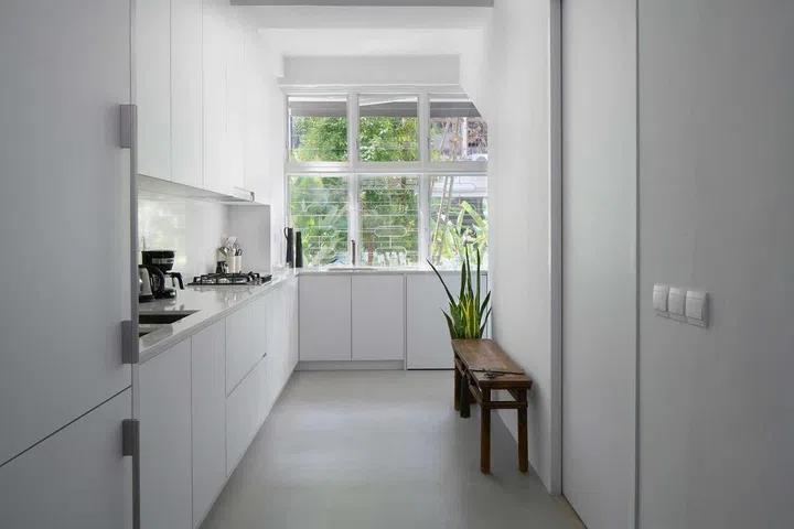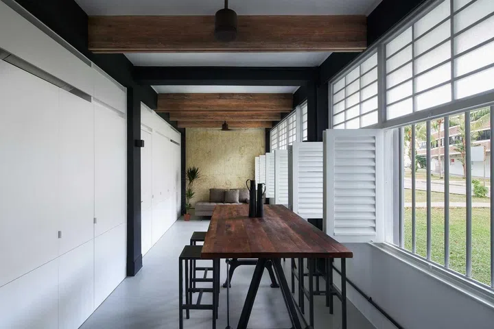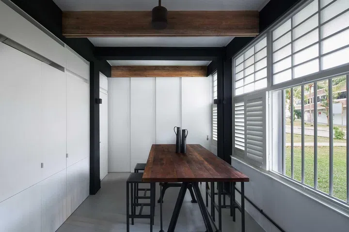 The Tiong Bahru ground floor home renovation focused on crafting flexible, welcoming spaces that could adapt to both quiet daily life and lively family gatherings. Perhaps the most ingenious transformation is the home’s perimeter - a versatile area that flows between the bedroom and common corridor.