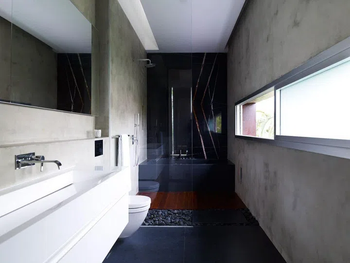 While the bathrooms sport the same look of simplicity and character, details such as wood panelling and dark rocks add to charm of the space.