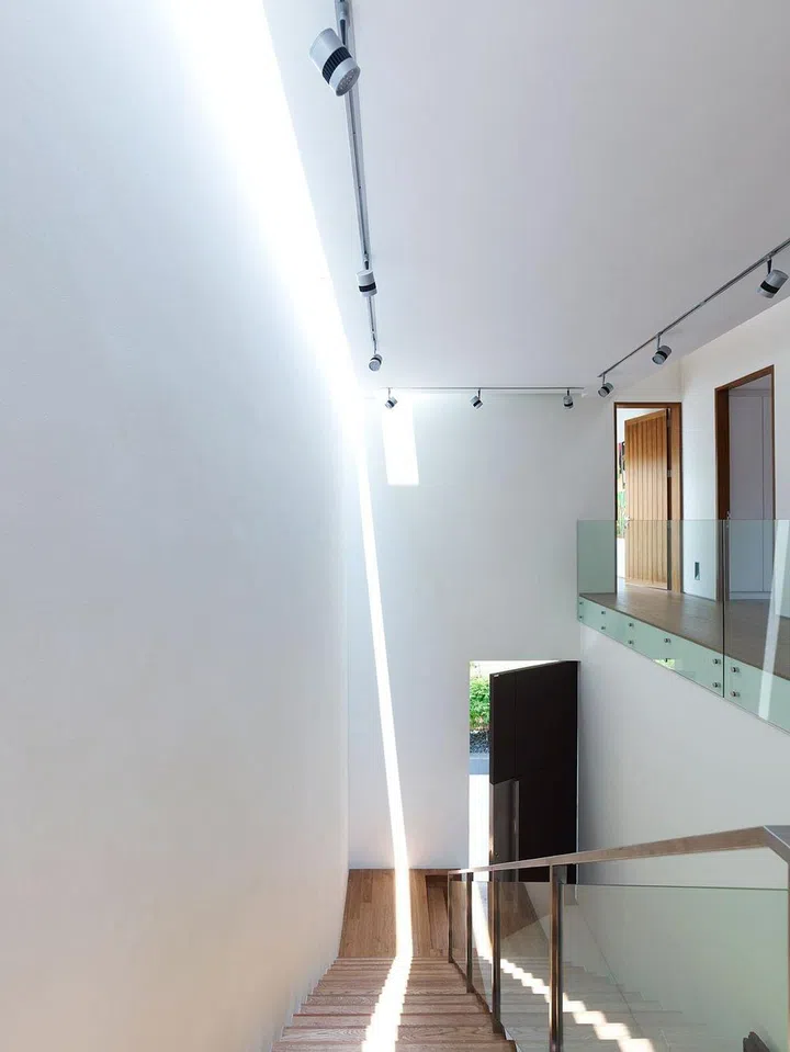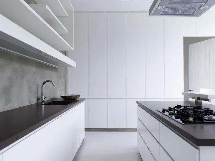 Within the home, a wash of white is used in the common spaces. Handle-less cabinets lay flush along the wall, creating a stylish and sophisticated look.
