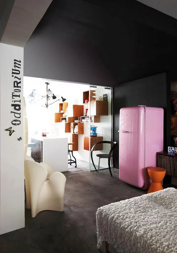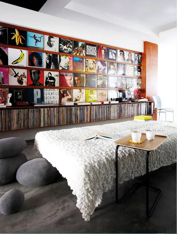 The homeowner's LP covers line an entire length of the living area, as do his CDs in the bedroom. Previously tucked away due to a lack of space, Lush opted for visible storage this time as "it's a waste not to display them".