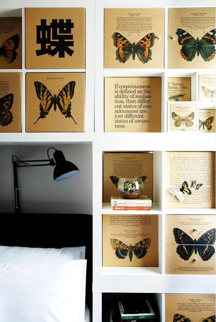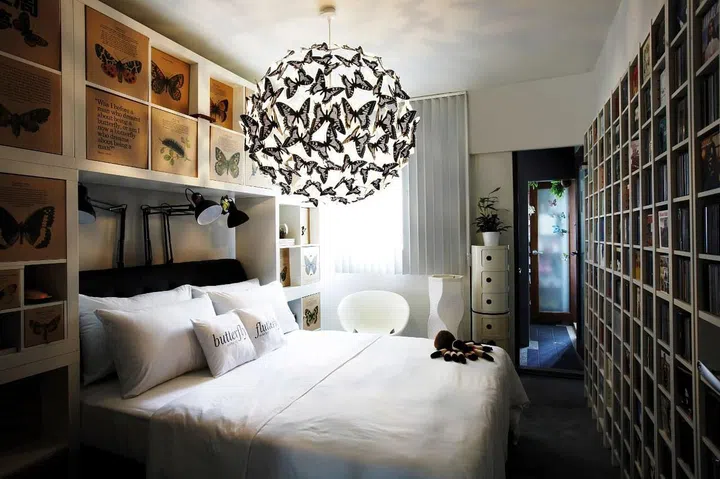 The centrepiece in the butterfly-themed bedroom is the dramatic, oversized Ikea pendant lamp, which Lush surrounded with striking cutouts of butterflies that filter the light for a softer glow.