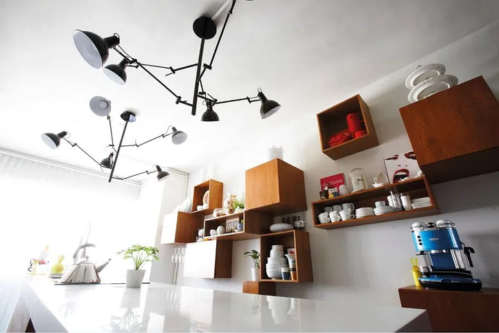 A mix of visible and hidden storage in the kitchen turns crockery into an attractive display while hiding clutter.