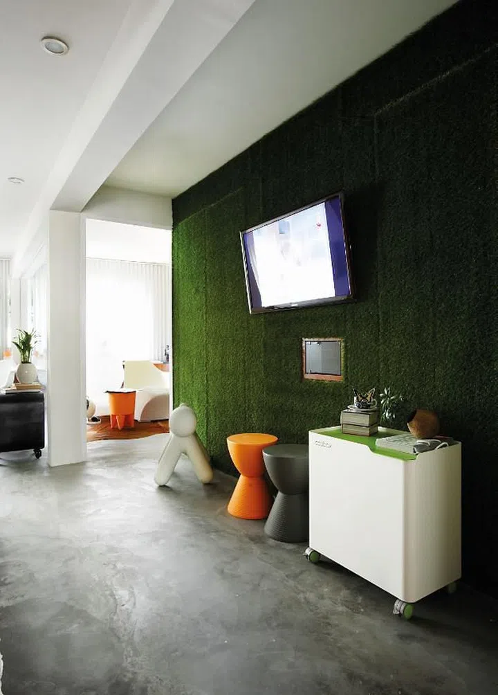 Layering artificial turf over a bank of cabinets transforms unsightly storage into a striking feature wall.