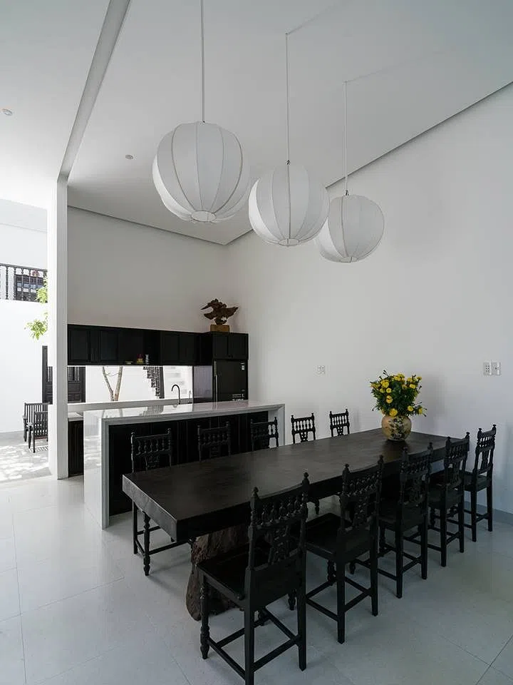 White lanterns above the dining area help to keep the interiors modern and sophisticated.
