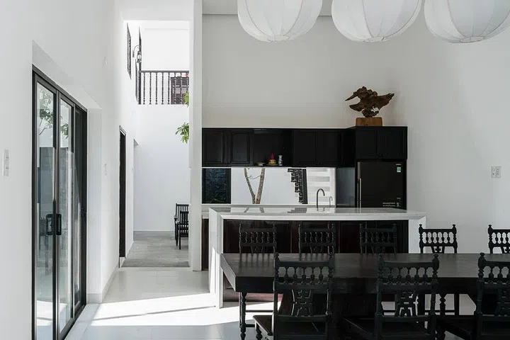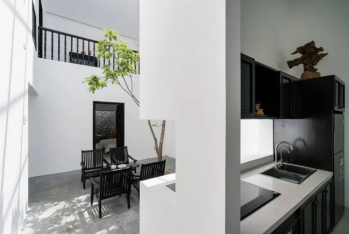 An open kitchen and a counter island acts as partitions between the front and back courtyards.