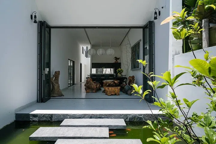 A pond is situated at the entrance of the home, with stepping stones leading to the front living room.
