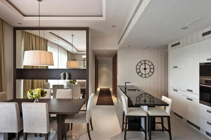 The use of mirrors over storage cabinets in the dining room creates the illusion of space.