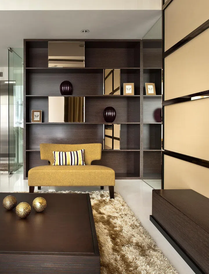 The feature wall in the living room is a composition of Mondrian-inspired grids, with a mirrored finish set against a backdrop of leather with a stingray skin texture.