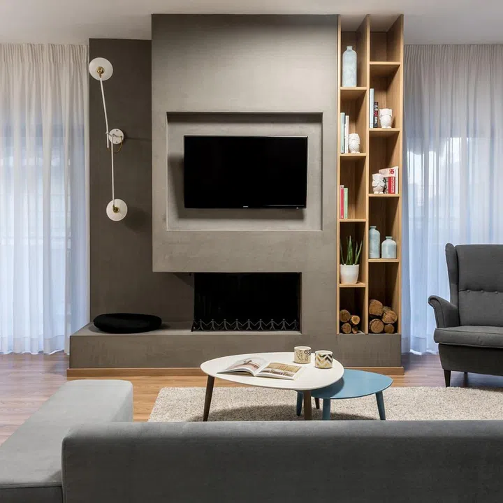 #2 When choosing edgier and raw materials such as concrete screed, balance it out with wood and soft furnishing. The wood adds warmth, while rugs and fabric seating create an inviting space. The designers opted for grey-hued fabric to match the concrete television feature wall.