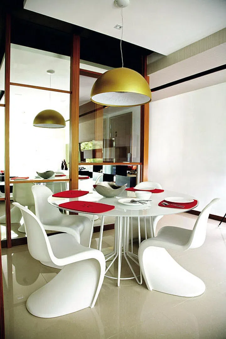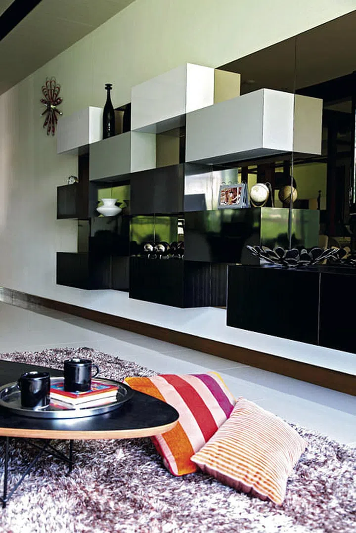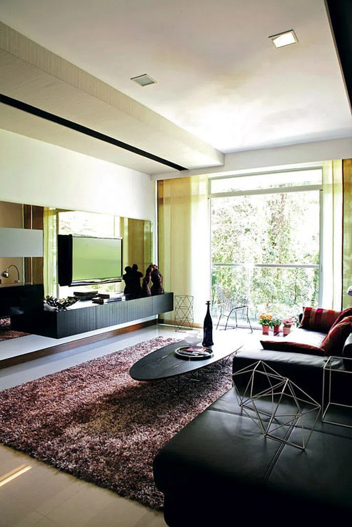 The homeowners of this three-bedroom flat in Bukit Timah opted for a muted palette and timeless pieces. They worked with interior designer C.K. Chan from IPO Design. The couple chose a sofa the colour of mocha and a shaggy rug in coffee-brown. For continuity in the colour scheme, tea-tinted mirrors frame the TV.