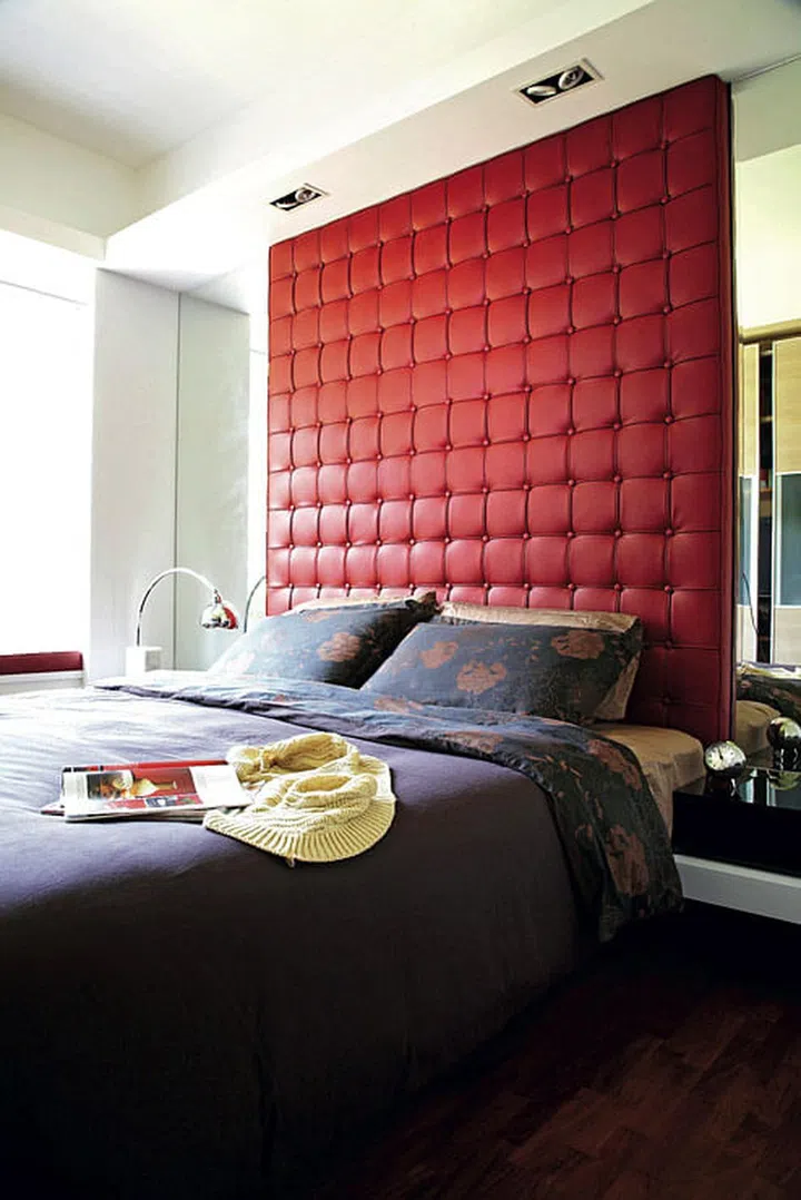 To add a touch of drama, a bold red PVC headboard was designed along with matching bay seat cushions.