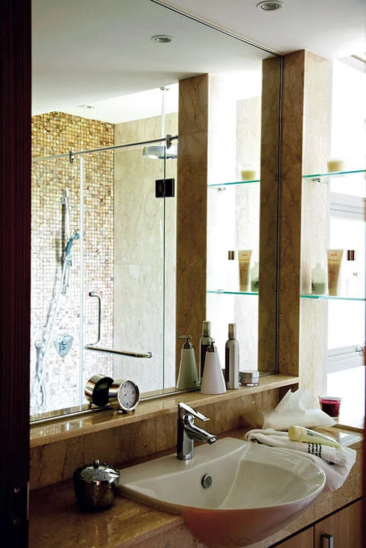 The wall design is made interesting with different treatments for the boxes. Conventional clear mirrors were also ditched in favour of tea-tinted ones.