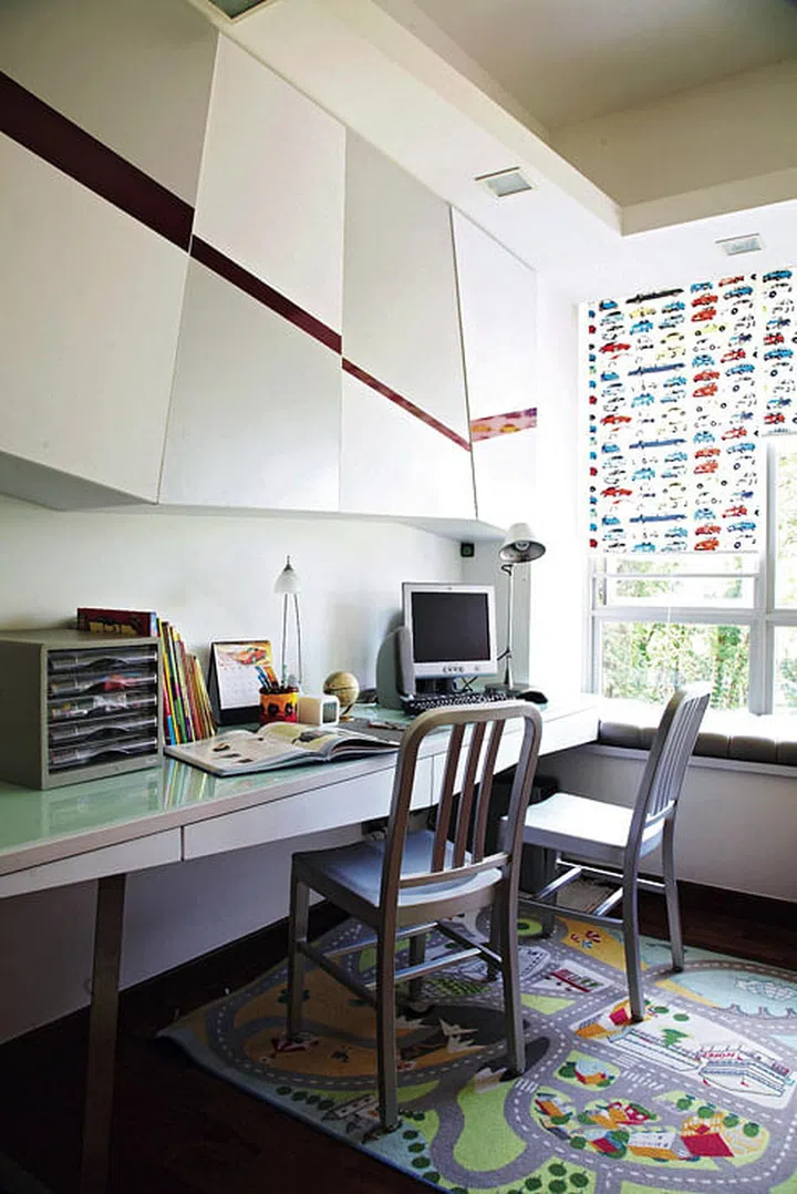 Space constraints were a challenge in the kids' room. A cabinet, long study table with drawers and bay seating were created to tackle the problem as they provide lots of storage.