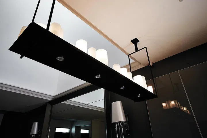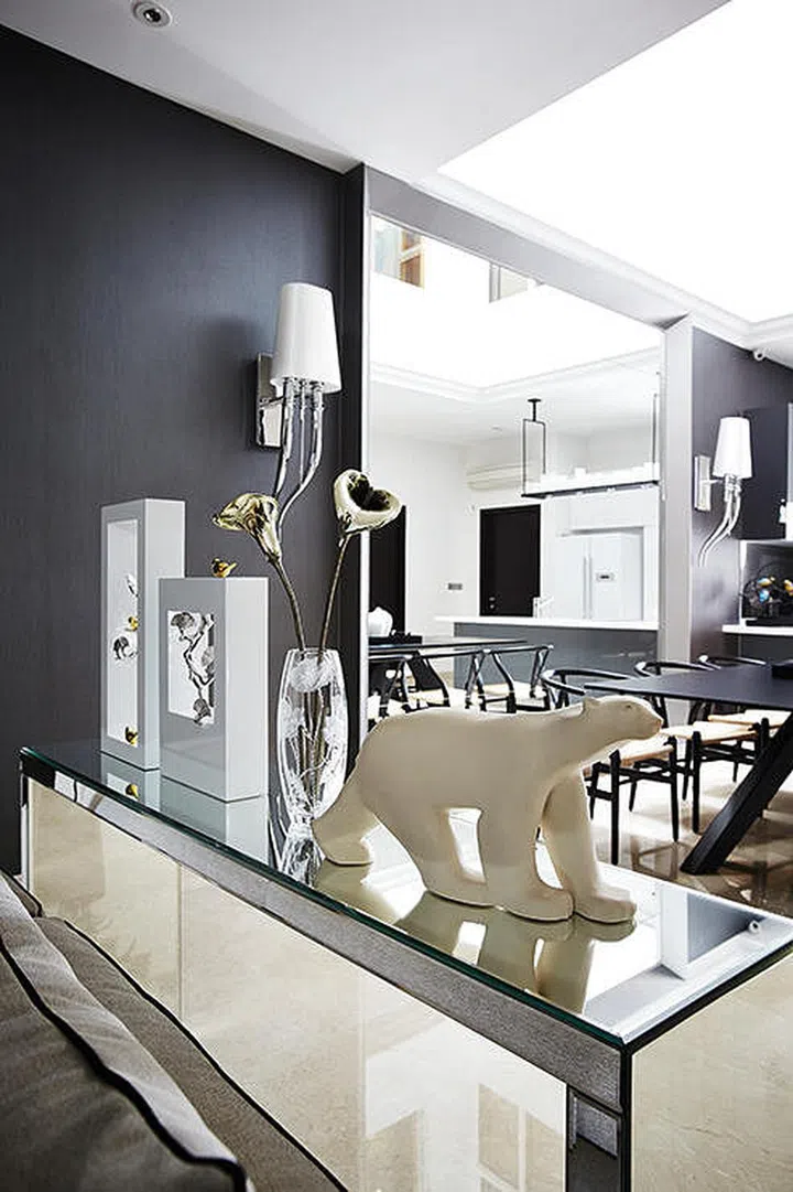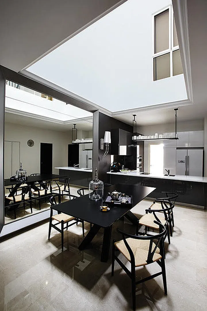 The designer installed a large framed mirror in the dining area, which sits right under a skylight, to maximise natural illumination and create a focal point.