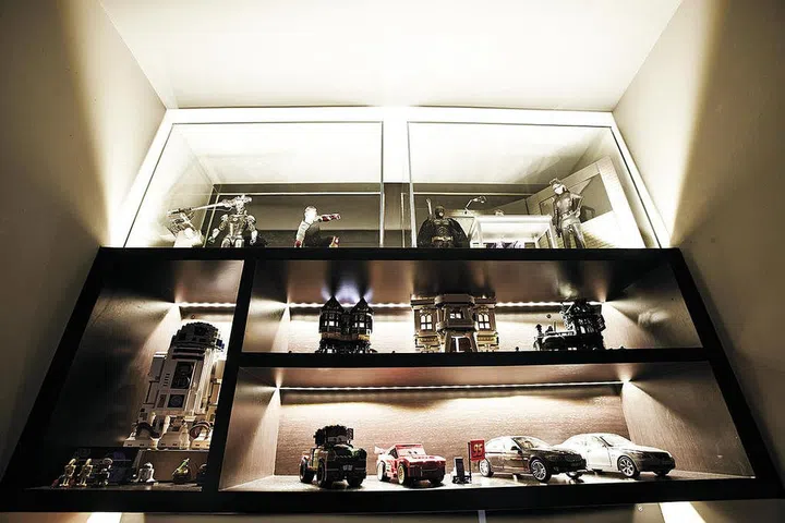 There is also a spotlighted display in the corner for the family to showcase their Lego figurines, miniature car models, collectibles purchased from the Harry Potter exhibition, and more.