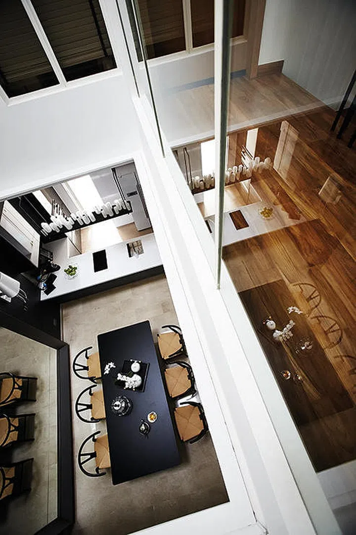 The sun-drenched dining space, visible from all floors, has been made the main focus of the triple-volume light well.