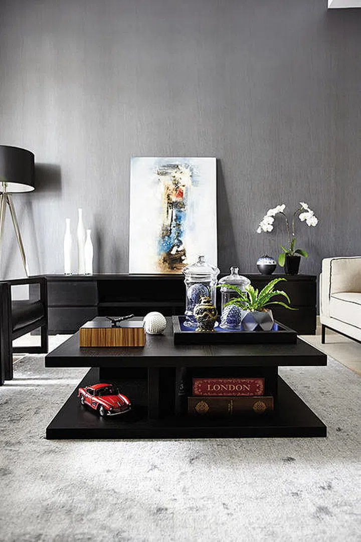 A colourful abstract painting on the sideboard punctuates the space's monochromatic colour scheme.